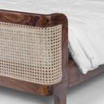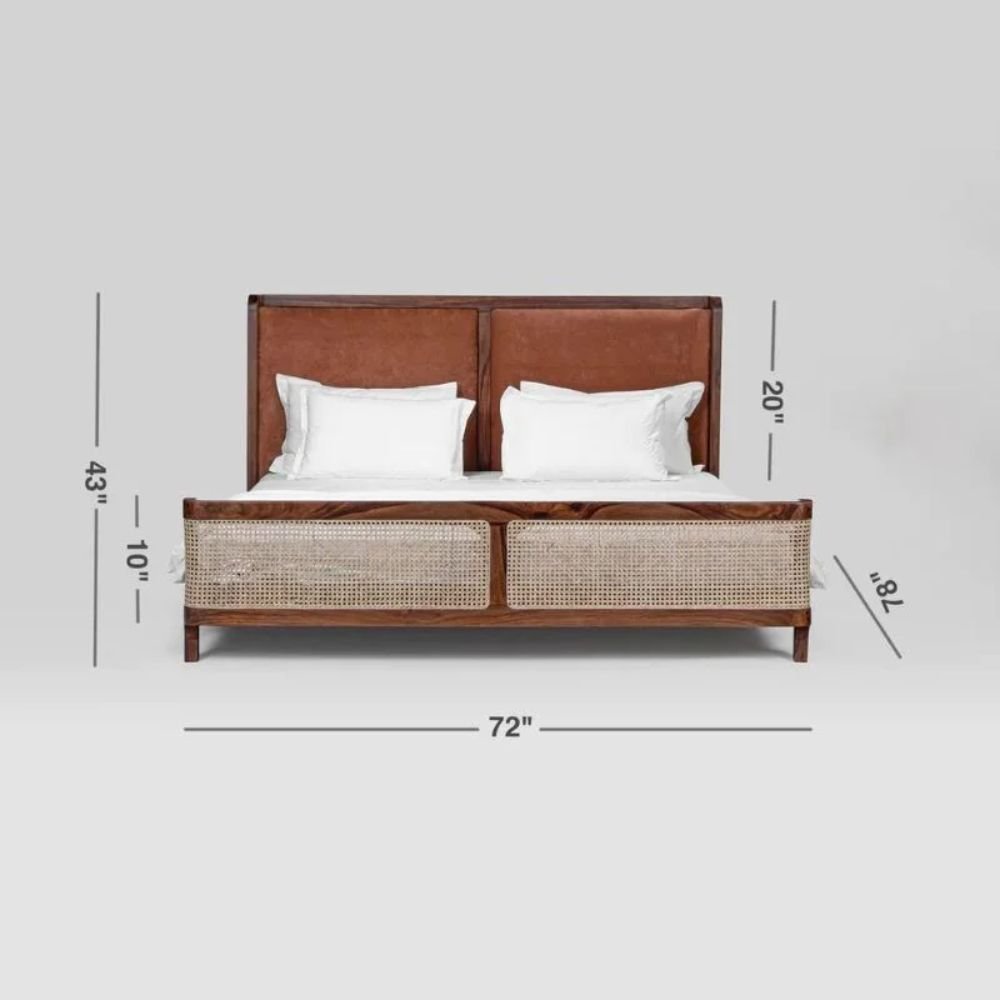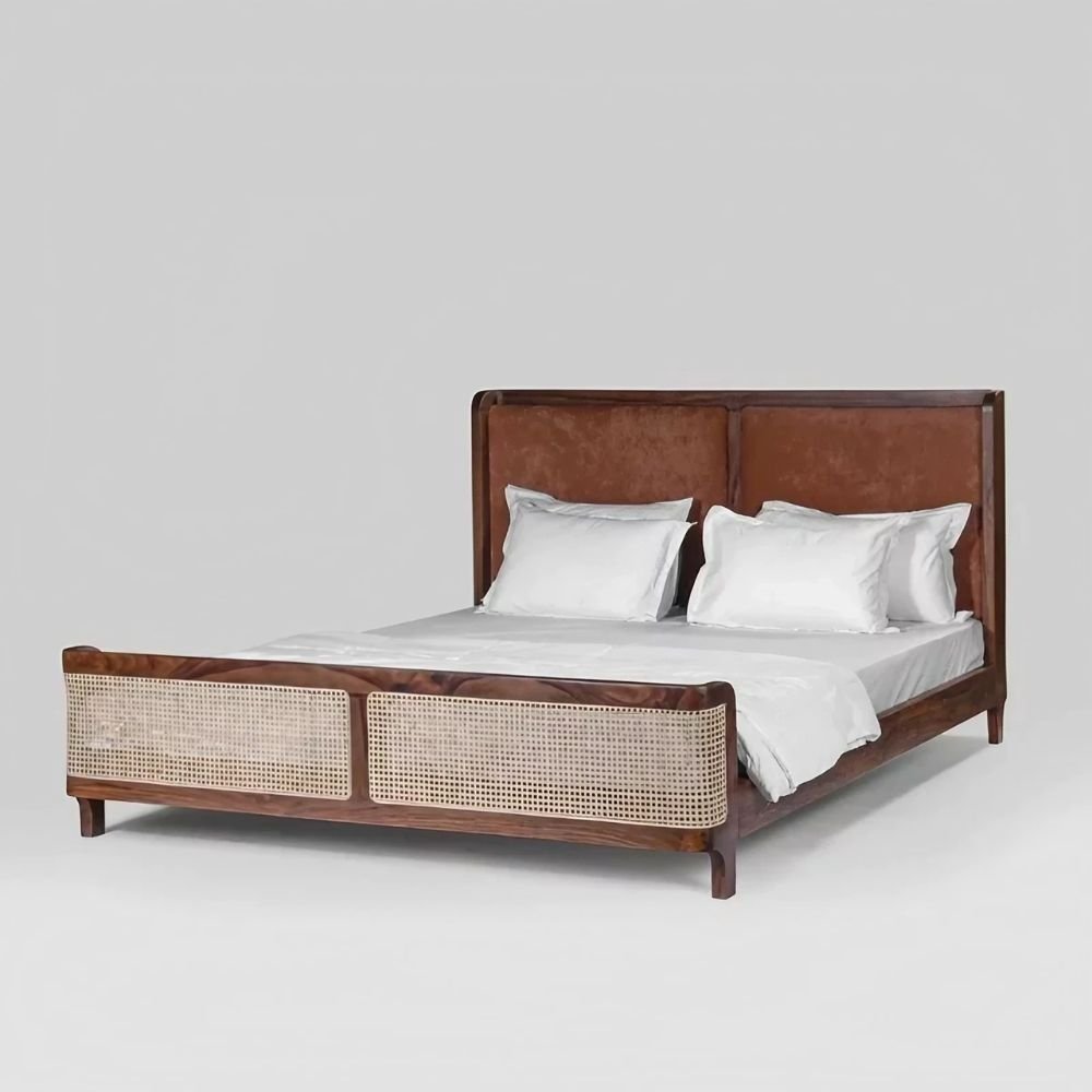 Mixed Material Aesthetic: Combines a padded tan headboard with hand-woven cane footboard panels for a rich, layered look.