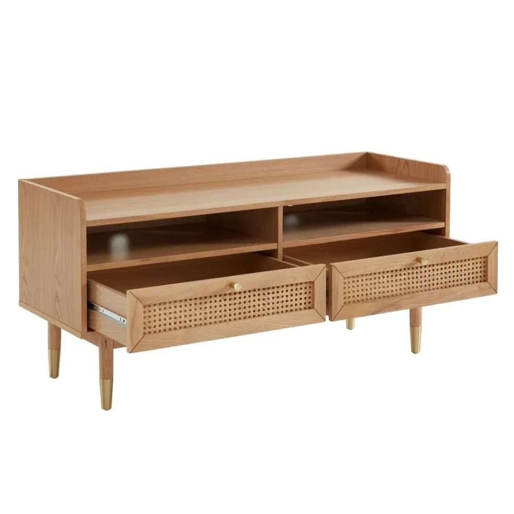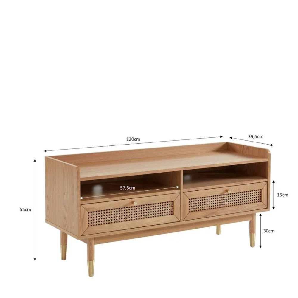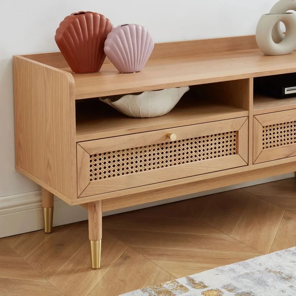 The finish depth is achieved through a multi-step staining process that highlights the 3D texture of the wood fibers and the organic weave of the cane. This creates a tactile experience where the material expression feels warm and organic to the touch despite its sturdy build. Light dances across the surface of the TV cabinet, revealing subtle variations in the wood grain that ensure no two pieces are exactly alike. It is this dedication to natural detail that elevates the product from simple furniture to a work of functional art. The signature gold-tipped legs add a continuous, flowing line that emphasizes the luxury of the piece.