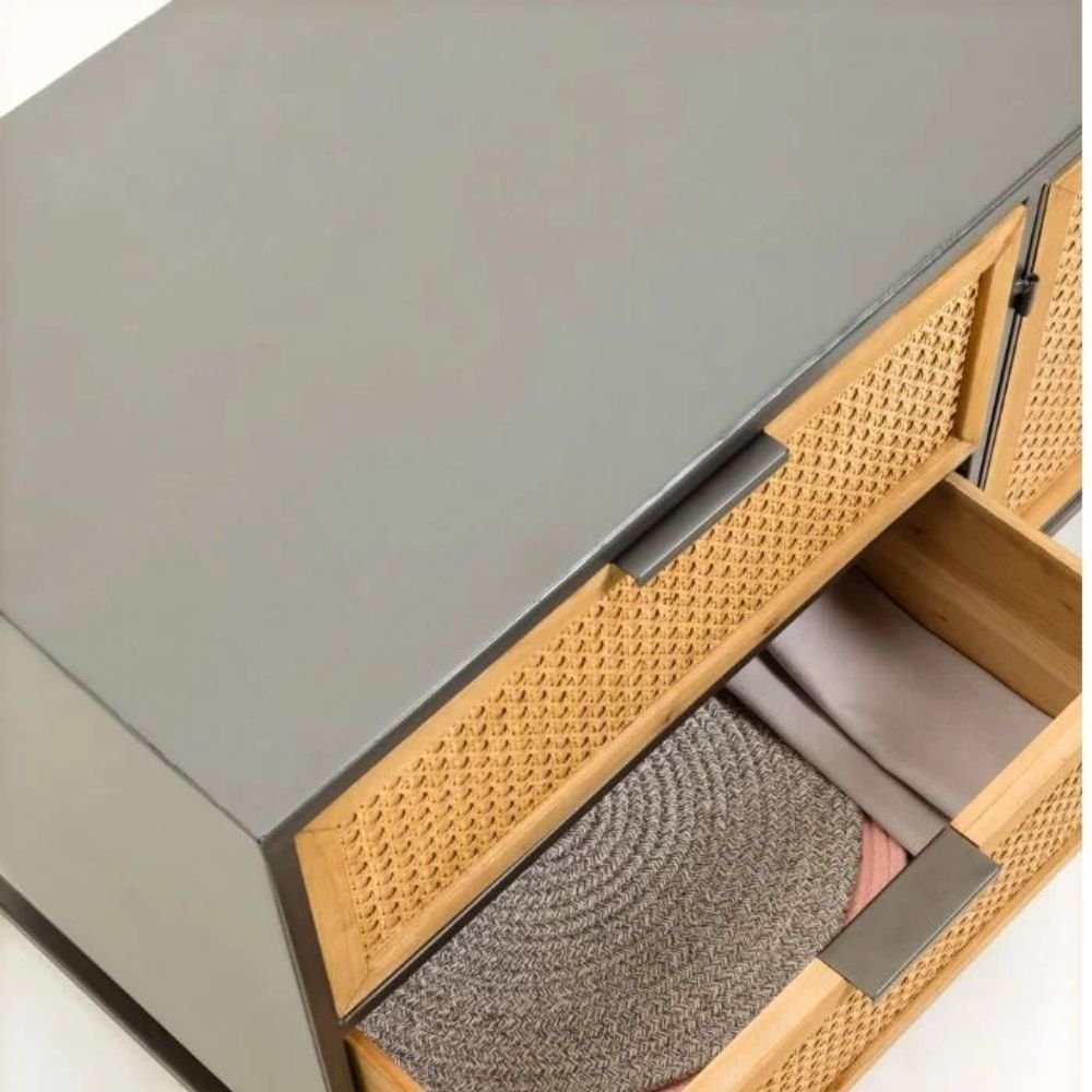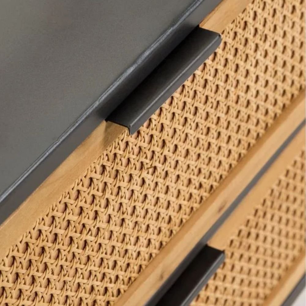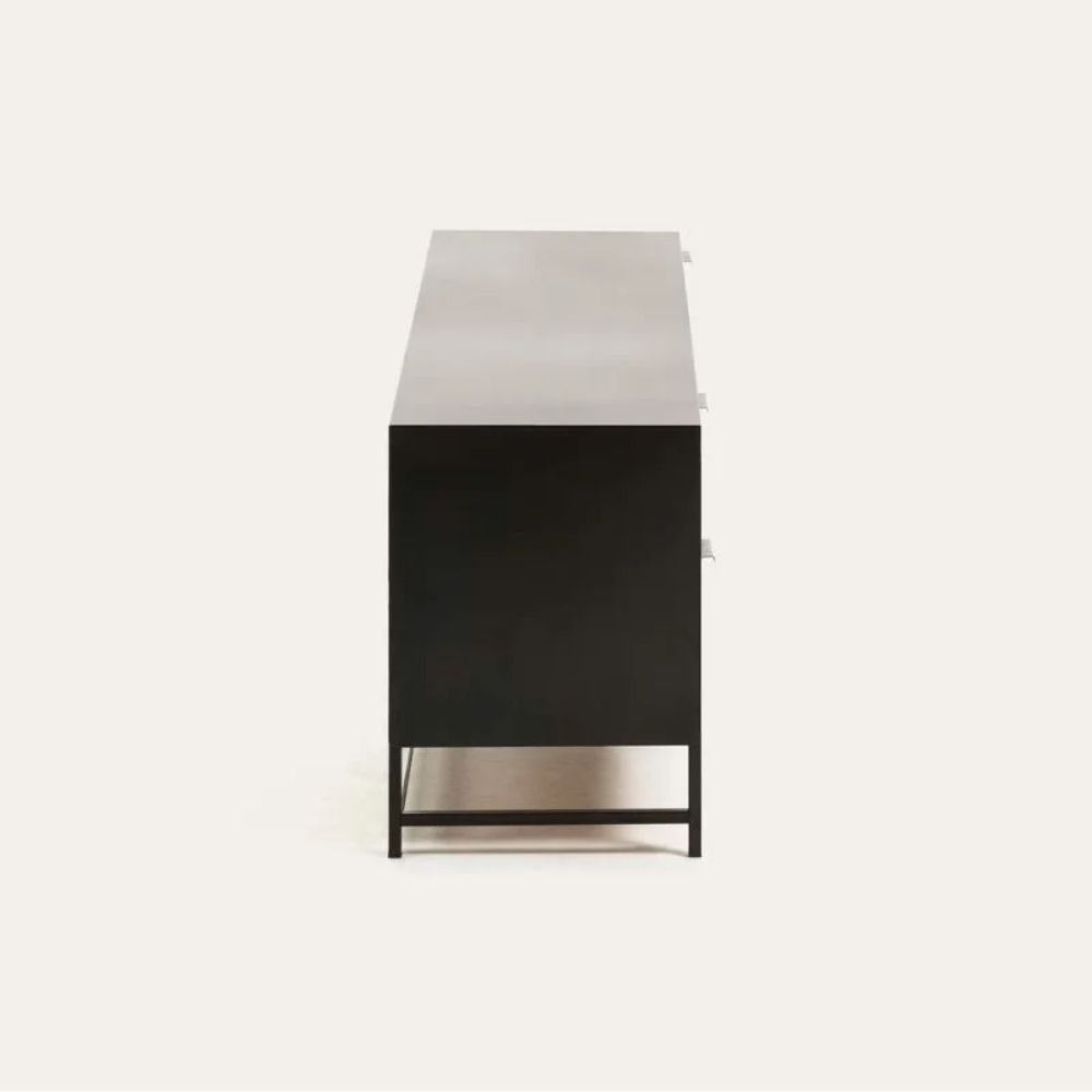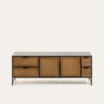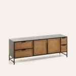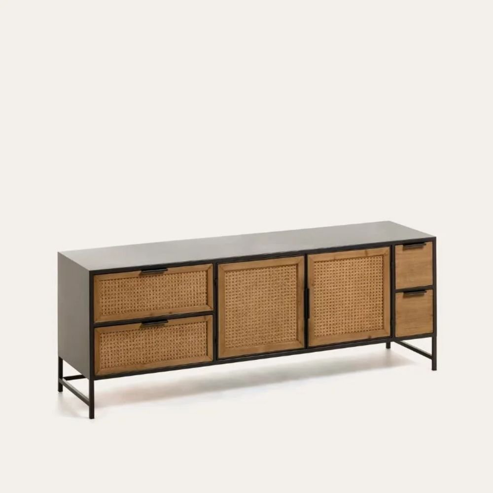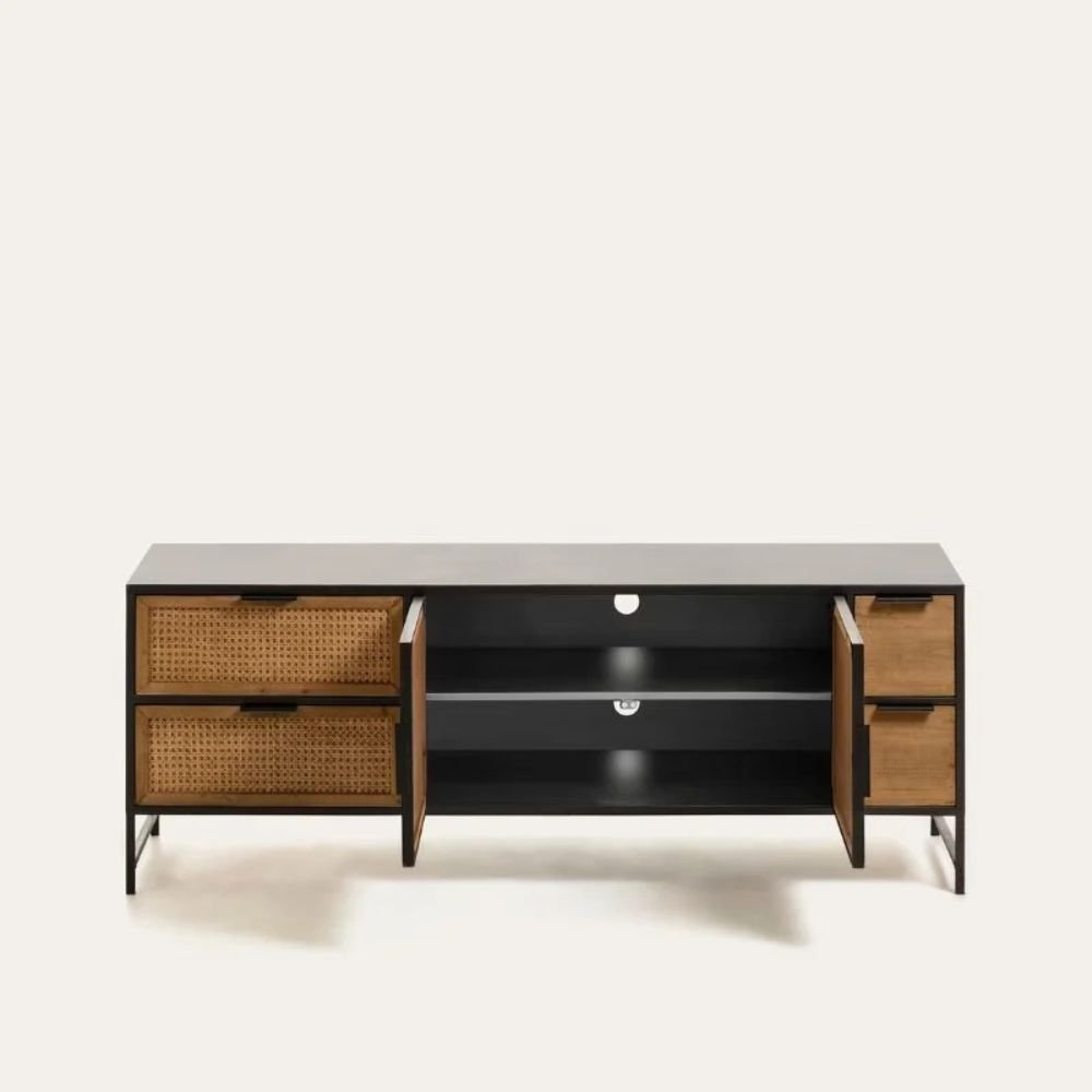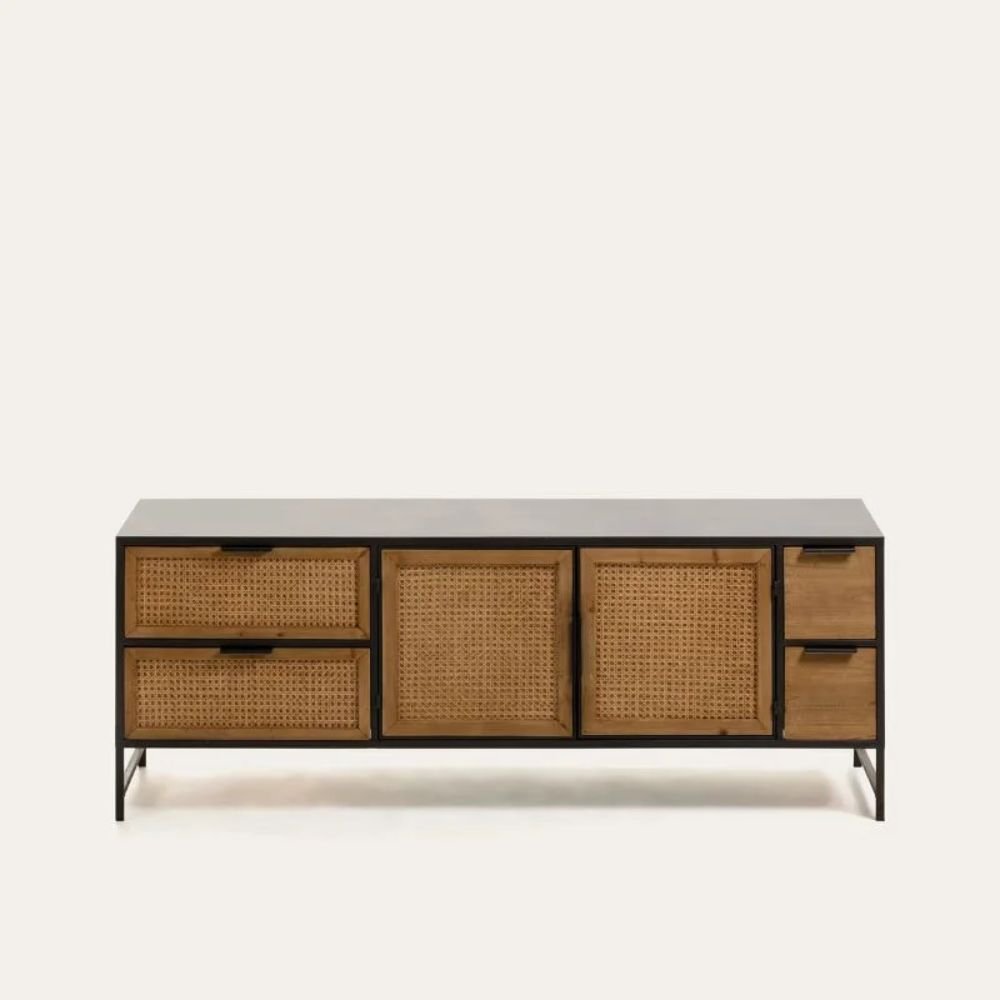A natural solid wood and cane TV unit with four drawers and two doors on a black metal base - Modera Furnish.