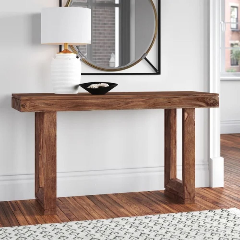 Every joint and angle is reinforced to provide a seamless look that hides the complexity of its construction. The substantial weight of the solid wood base ensures that the console table stays securely in place, even in high-traffic areas of the home. By prioritizing a “less is more” approach, the design focuses on clean lines and a bold footprint, making this console table an essential element for organized and sophisticated modern living spaces. The internal framing is built to handle significant weight, allowing for a diverse range of decorative configurations while maintaining its perfectly level and sleek architectural profile.