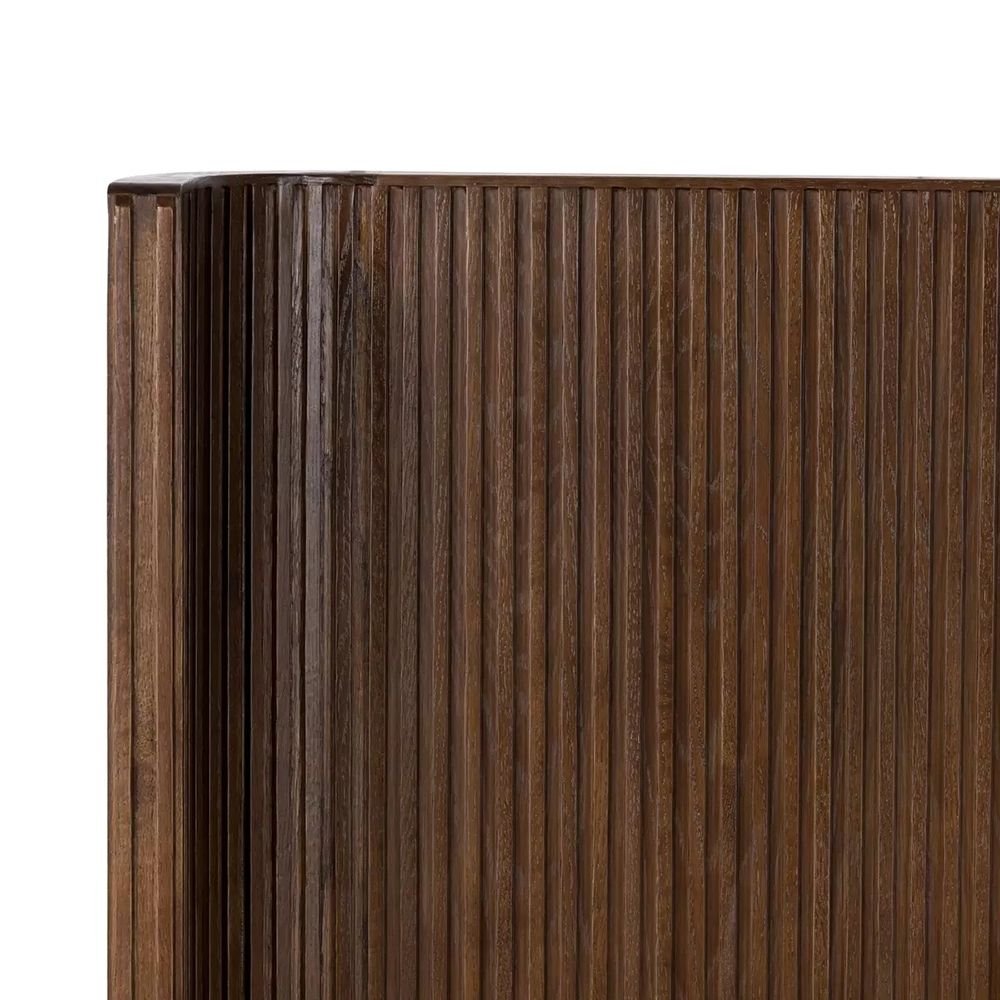 The finish depth is achieved through a multi-step staining process that highlights the 3D texture of the vertical grooves. This creates a tactile experience where the material expression feels warm and organic to the touch despite its sturdy build. Light dances across the fluted headboard, revealing subtle variations in the solid wood bed that ensure no two pieces are exactly alike. It is this dedication to natural detail that elevates the product into a work of functional art for the home. The signature curved edges create a continuous, flowing line that emphasizes the seamless luxury of the solid wood.