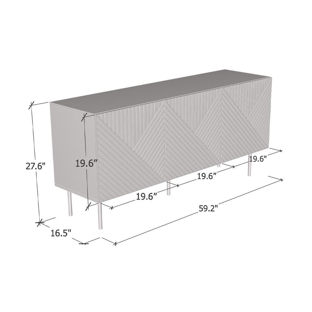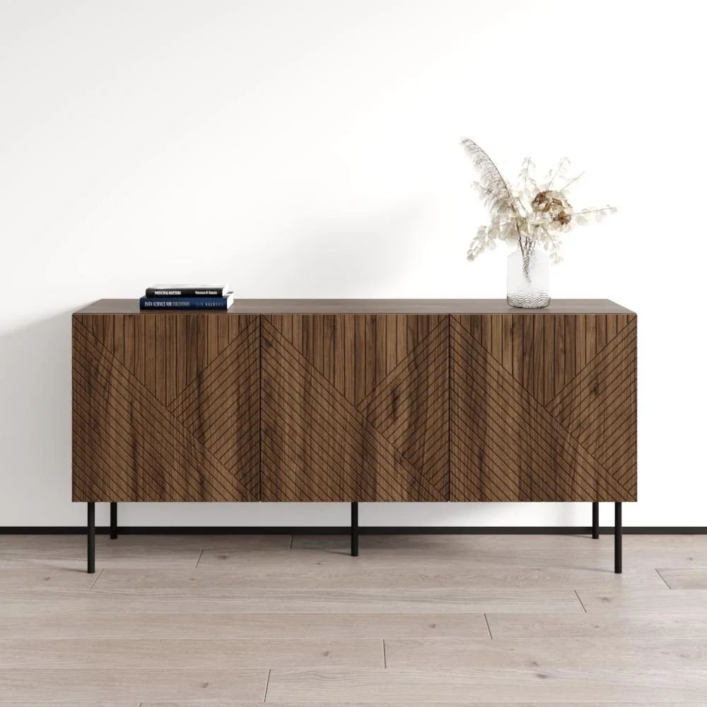The chromatic depth of this sideboard is realized through a precision etching process that creates a multi-dimensional 3D geometric chevron pattern across the three-door façade. This evokes a tactile sensation where the material feels warm and authentic to the touch, despite its industrial-grade sturdiness. Light traverses the surface, illuminating subtle nuances in the grain and the depth of the geometric lines, ensuring each piece is an individual masterpiece. It is this devotion to naturalistic detail that elevates the piece from mere utility to a work of functional art. The signature push-to-open door mechanism preserves the linear purity and architectural integrity of the front profile by removing the need for external hardware.