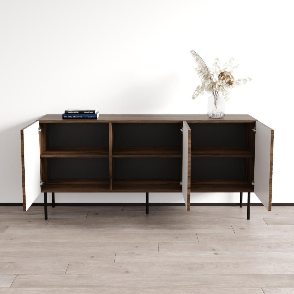 Every miter and radius of this sideboard is reinforced to yield a seamless exterior that celebrates the innate durability of the timber. The substantial ballast of the solid wood frame, supported by six industrial-grade metal pin legs, ensures the unit remains immovable during daily use. By prioritizing a “storage-centric” philosophy, the design emphasizes linear purity and a functional footprint, establishing this sideboard as a fundamental component of the sophisticated modern workspace or dining area. The internal armature features dual-tier shelving calibrated to support significant weight while maintaining its perfectly level and sleek architectural profile.