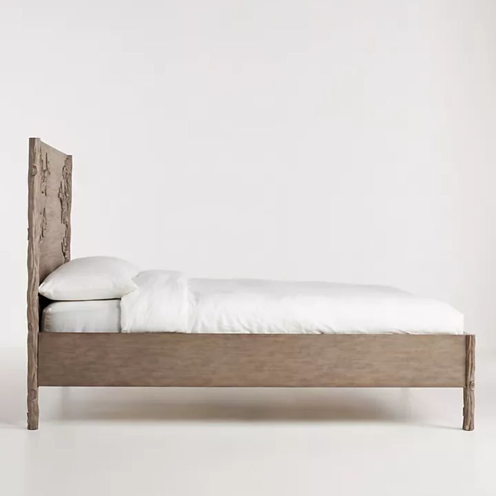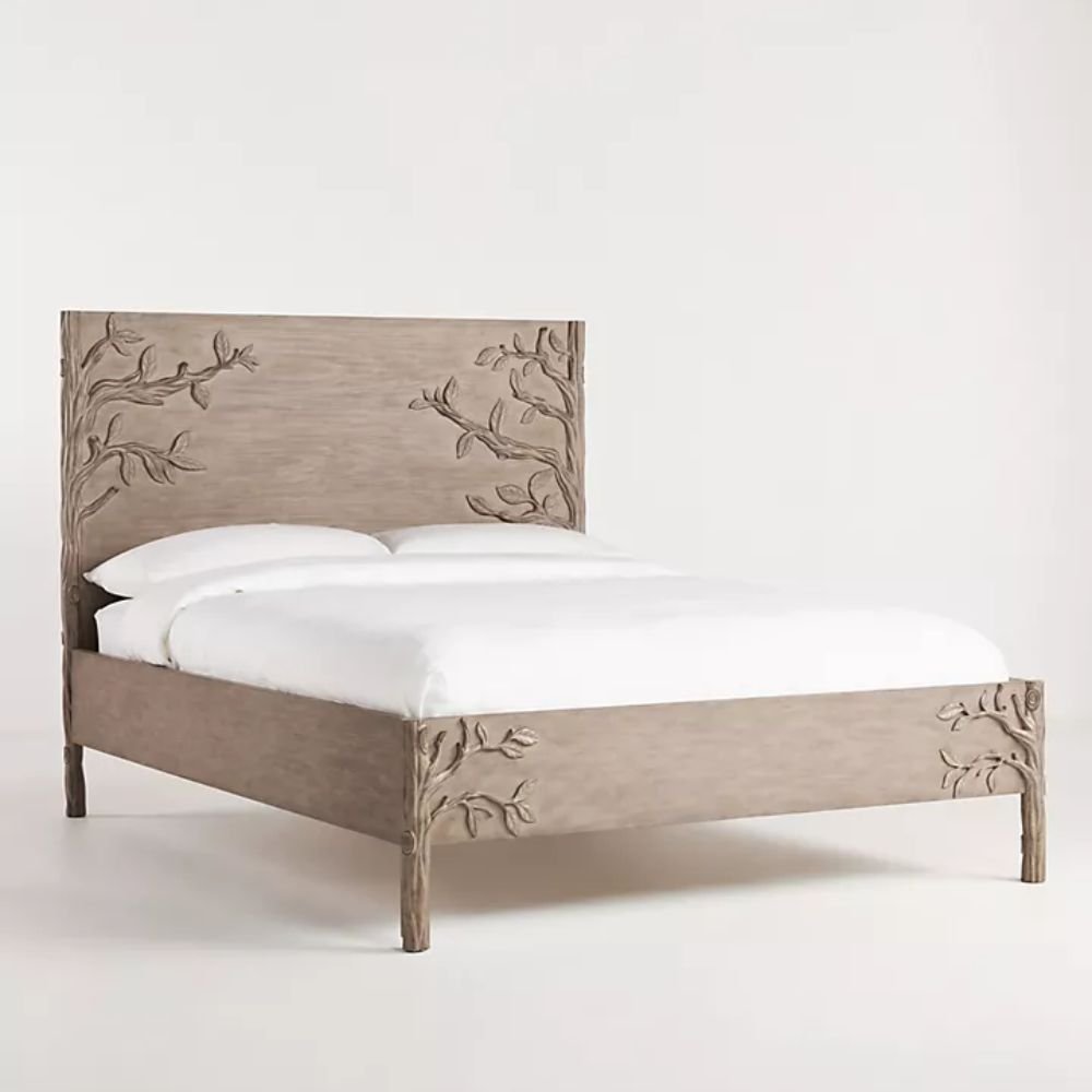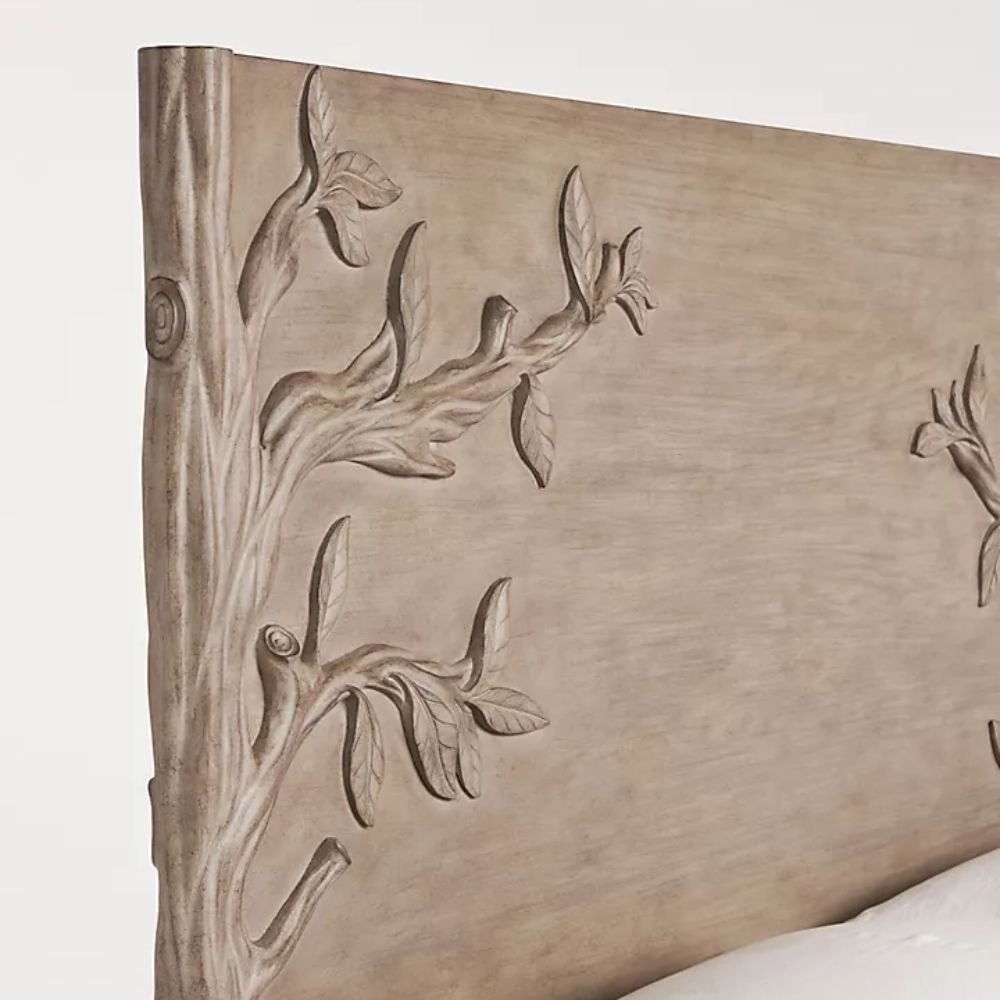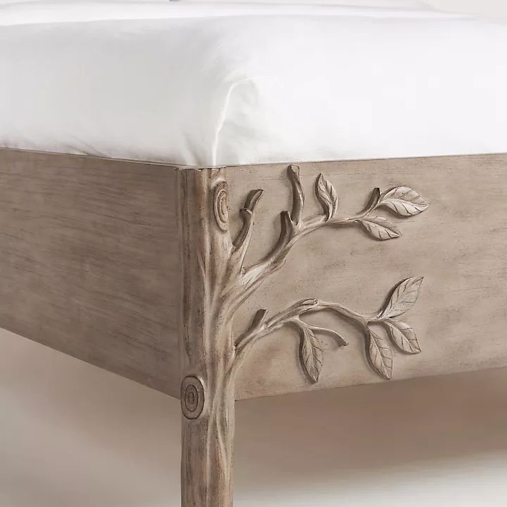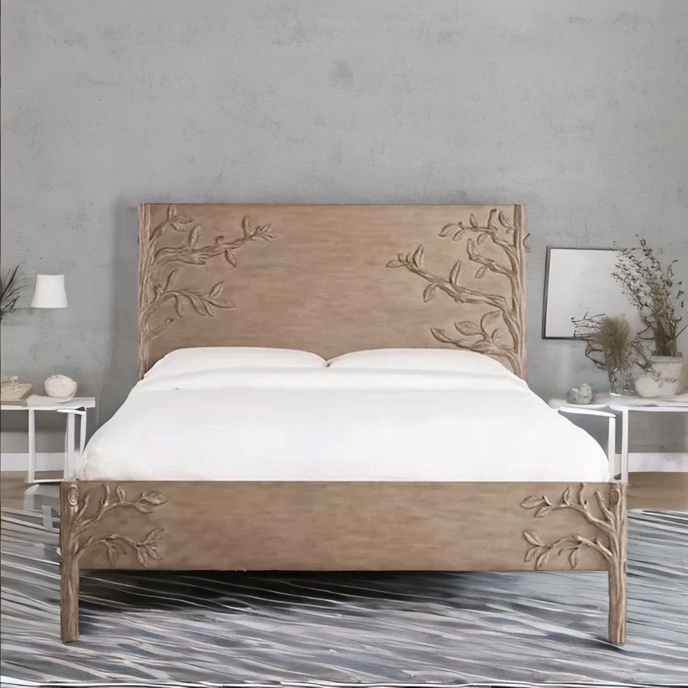 Hand-Carved Artistry: Features unique floral branch motifs carved into the headboard and footboard for an artisanal touch.