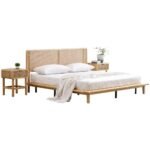 A natural light wood low-profile platform bed with a dual-panel hand-woven cane headboard - Modera Furnish.
