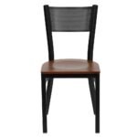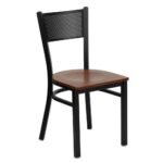 Modern solid wood and metal dining chair with perforated backrest in mahogany and black finish for contemporary interiors - Modera Furnish