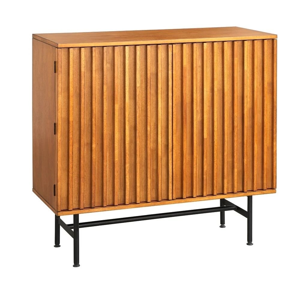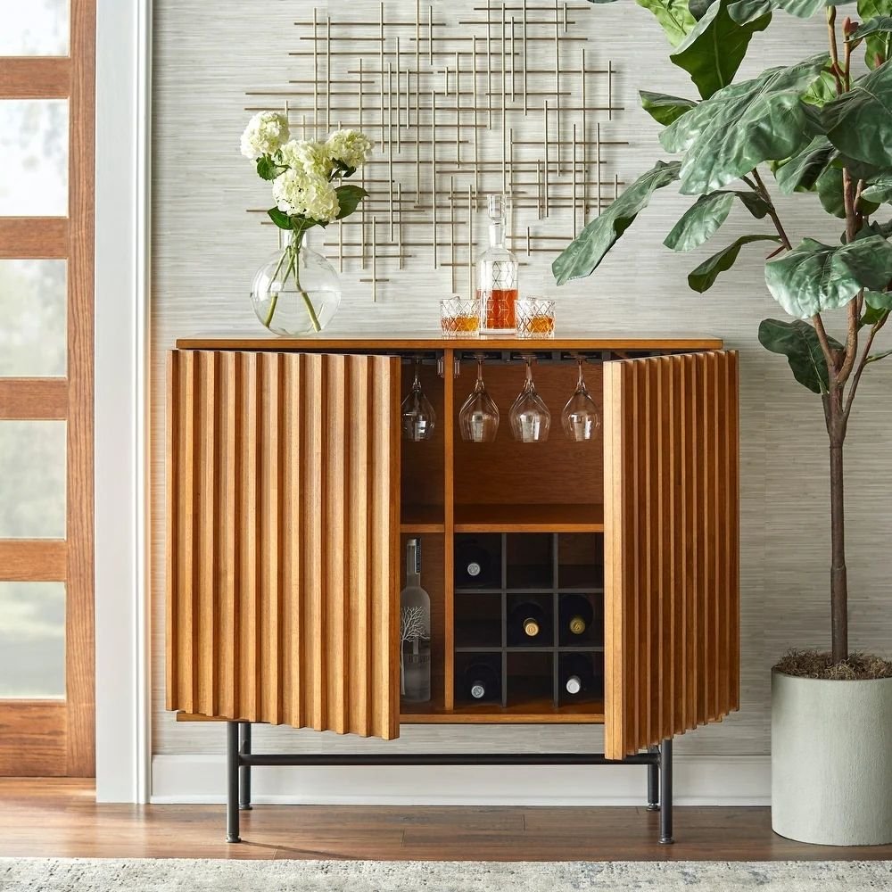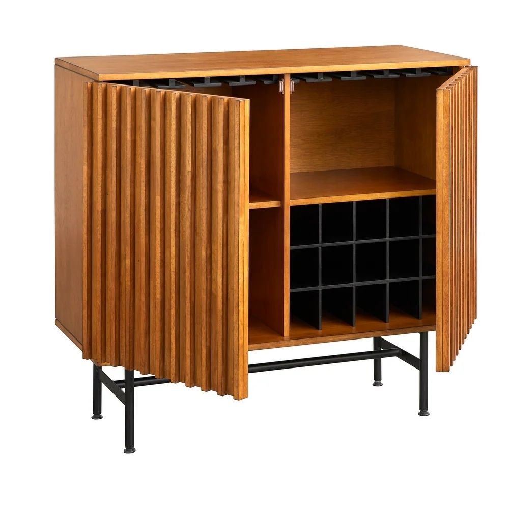 With its vertical slatted wooden doors and sleek silhouette, this bar cabinet draws from mid-century architecture and furniture design. The rich brown stained finish and subtle metal accents create a stunning interplay of tone and texture. Its clean lines, soft sheen, and elevated base make it an instant focal point in your home.