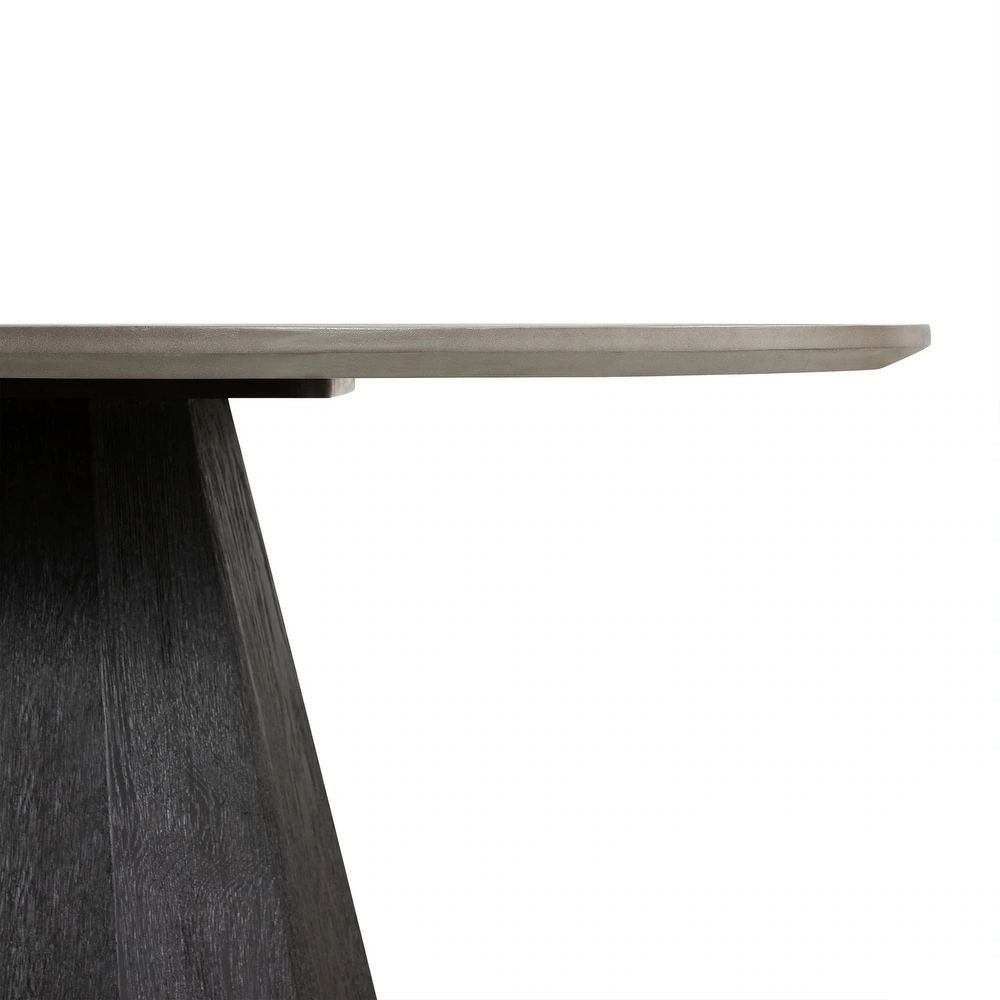 The pedestal base features clean, faceted planes that introduce sculptural interest beneath the tabletop. The contrast between the smooth circular surface and the angular base creates a dynamic visual balance. Together, these elements form a layered, three-dimensional design that feels modern, grounded, and intentionally crafted from every angle.