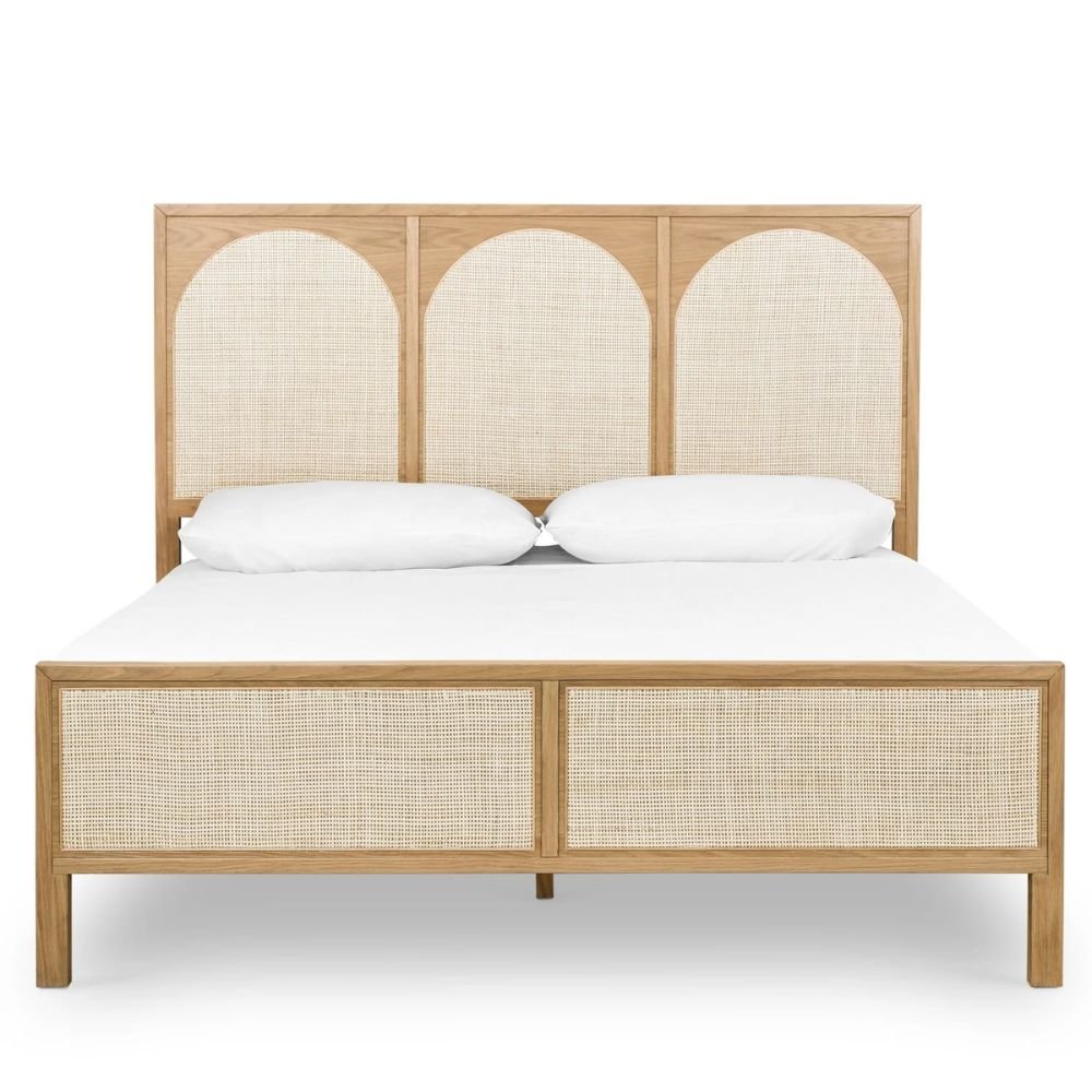 A natural finish hardwood king-size bed featuring a high three-paneled arched headboard with hand-woven rattan inlays - Modera Furnish.