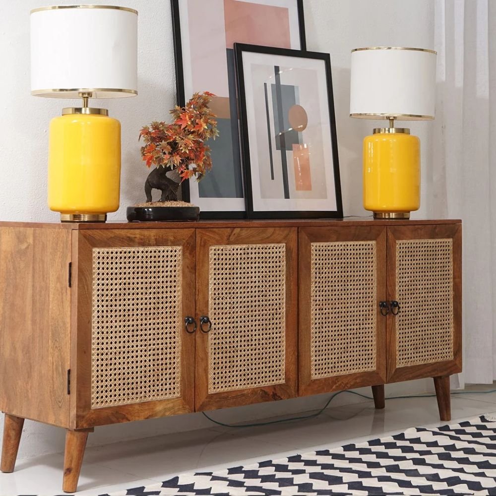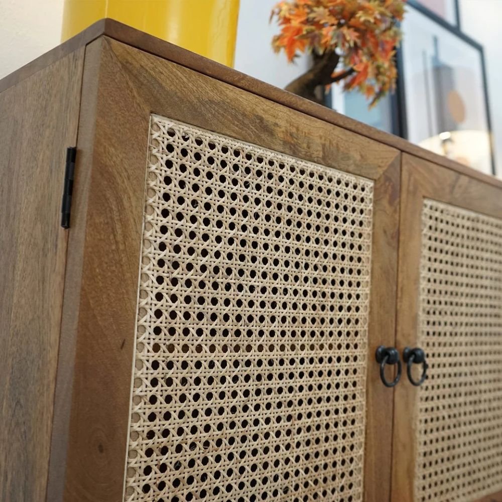 A long brown solid mango wood cabinet with four doors featuring hand-woven cane panels and circular metal pulls - Modera Furnish.