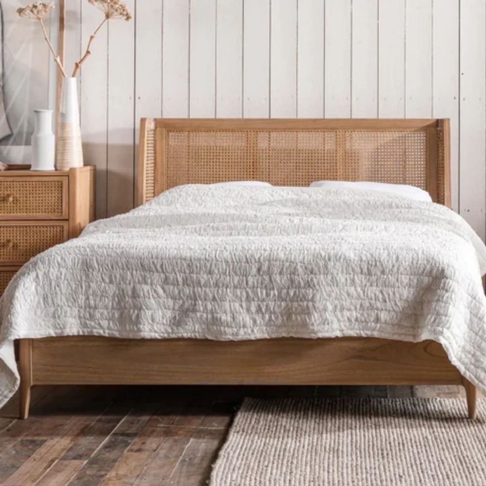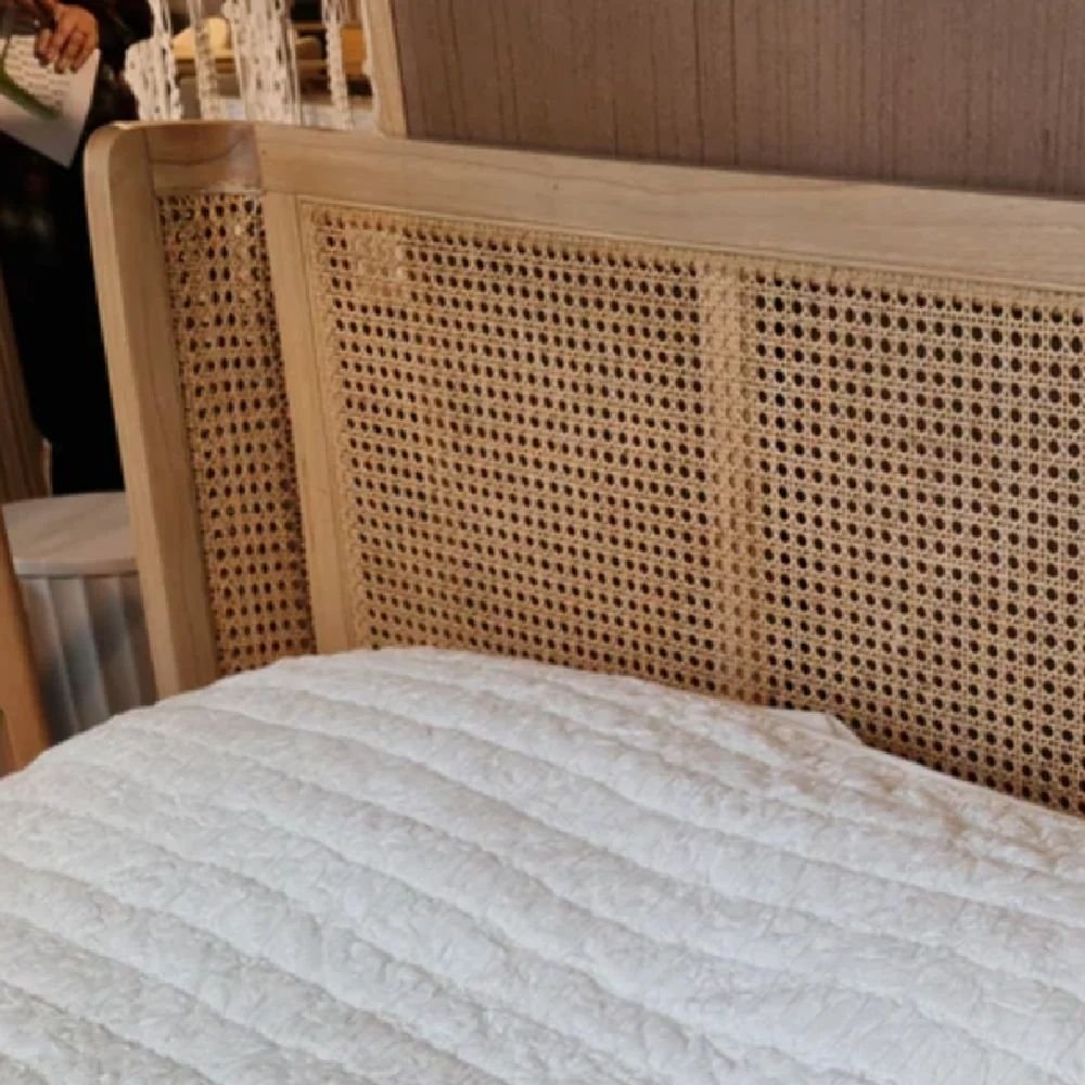 Wingback Cane Headboard: Features a sophisticated wraparound design with three hand-woven cane panels for an immersive aesthetic.