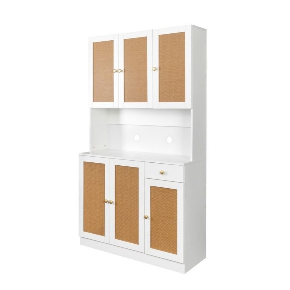 This closet enhances interior spaces by pairing clean lines with warm textured details, striking a balance between simplicity and sophistication. The tall structure introduces vertical rhythm, making the room feel more proportioned and airy. Its combination of concealed storage and open display sections ensures both functional organisation and decorative charm.