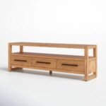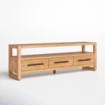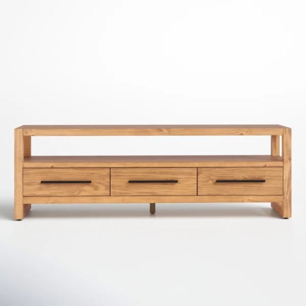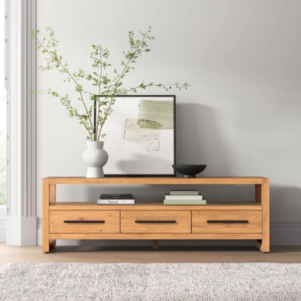 Multiple drawers provide concealed storage for media accessories, remote controls, and small essentials, keeping the surface clutter-free. An open shelf above the drawers supports set-top boxes or display objects while allowing airflow for electronics. The solid wood frame ensures rigidity across the full width of the TV unit, maintaining alignment even under consistent load. The low stance improves screen viewing ergonomics while reinforcing structural stability.