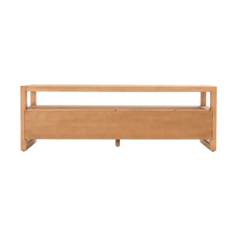 The natural wood grain softens modern interiors while pairing effortlessly with neutral walls and textiles. Its low height keeps sightlines open, allowing artwork or shelving above to remain visually prominent. Whether styled minimally or layered with décor, the TV unit supports a composed, well-organized living environment. Beyond its functional role, this TV unit contributes to a sense of order within the living space by clearly defining the media zone. Its extended width allows visual alignment with sofas, rugs, and wall art, creating a cohesive horizontal rhythm across the room. This sense of alignment helps the space feel intentional rather than assembled, particularly in open-plan living areas where furniture placement carries greater visual weight.
