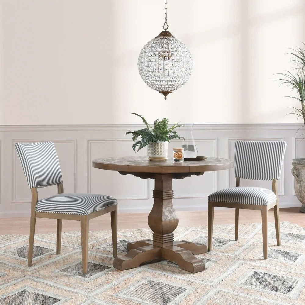 Crafted from solid wood and finished in a softly distressed brown tone, the table feels both grounded and inviting. Its round shape encourages conversation and connection, making it ideal for casual meals, intimate gatherings, and relaxed everyday dining. Whether placed in a breakfast nook or a dedicated dining area, this table creates a sense of comfort and balance that defines farmhouse interiors.