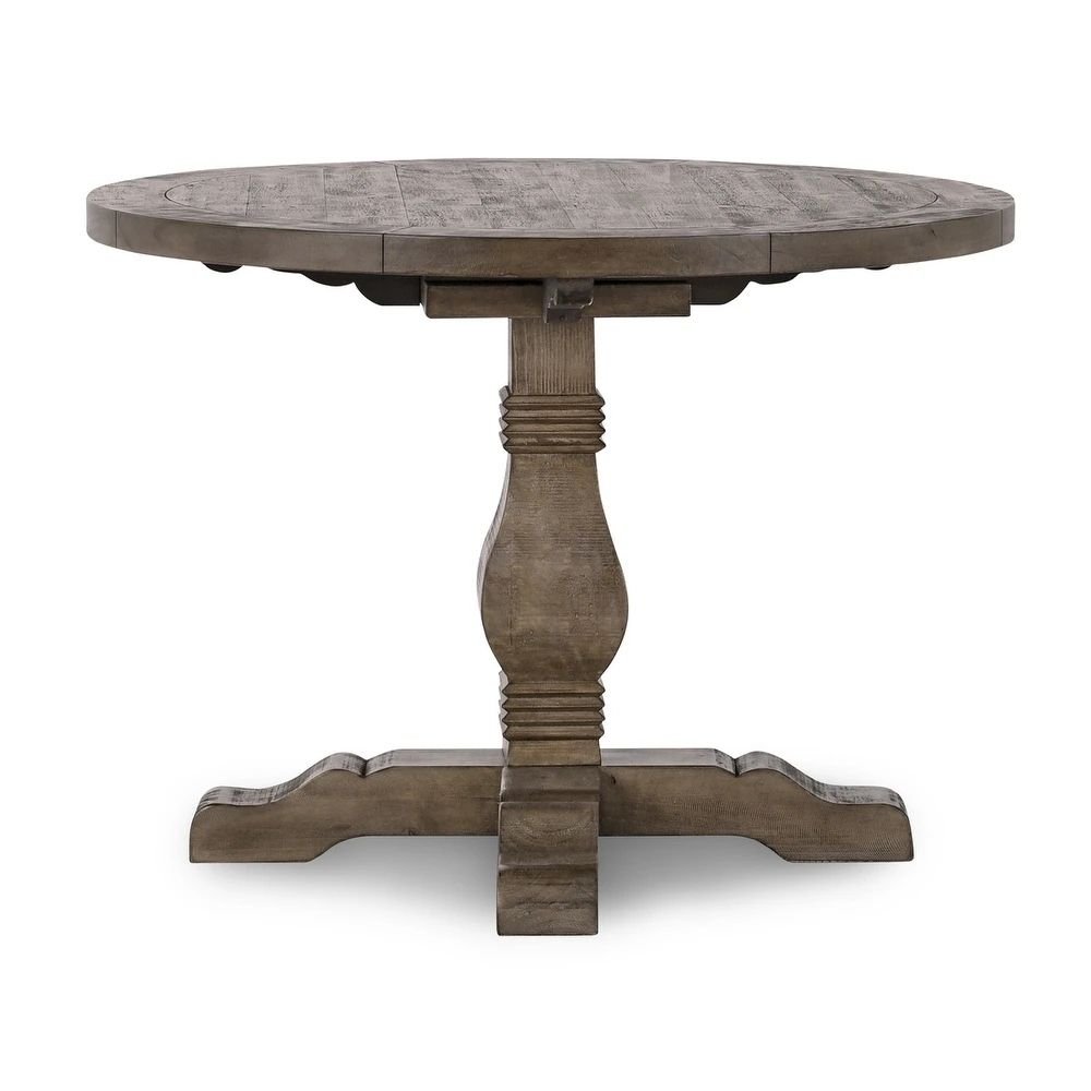 Solid wood round farmhouse dining table with pedestal base and weathered brown finish – Modera Furnish