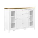 The height of 35.5 inches is ideal for creating a layered vignette with coffee machines, jars, and framed artwork. By introducing the crisp white tones and warm wood top of this storage sideboard, you add a layer of sophistication that feels both grounded and airy. Whether styled with minimalist ceramics or lush greenery, the impact of the wood texture creates an inviting atmosphere that reflects a high standard of living and a keen eye for contemporary design. The glass-front detailing allows for dynamic decor displays, making the piece a versatile asset as your personal style evolves over time.