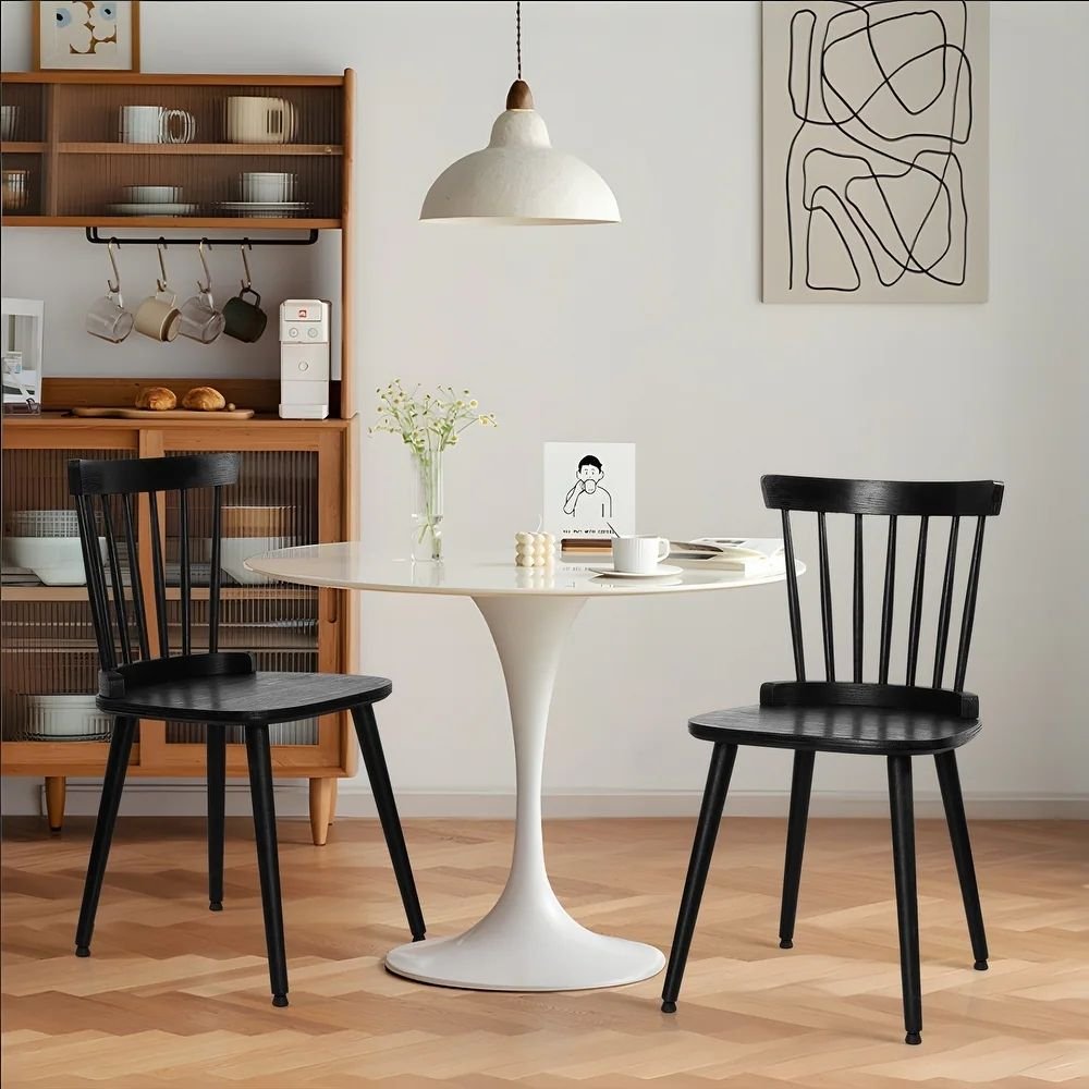 Made entirely from solid wood, this Windsor dining chair set reflects a thoughtful blend of traditional inspiration and contemporary restraint. The black finish gives the chairs a clean, modern edge while allowing the iconic spindle-back design to remain the focal point. Designed for daily use, these dining chairs provide reliable comfort, visual clarity, and long-term durability. Their understated presence allows them to integrate seamlessly into a wide range of interiors, from modern homes to transitional dining settings, without appearing heavy or overly decorative.