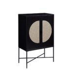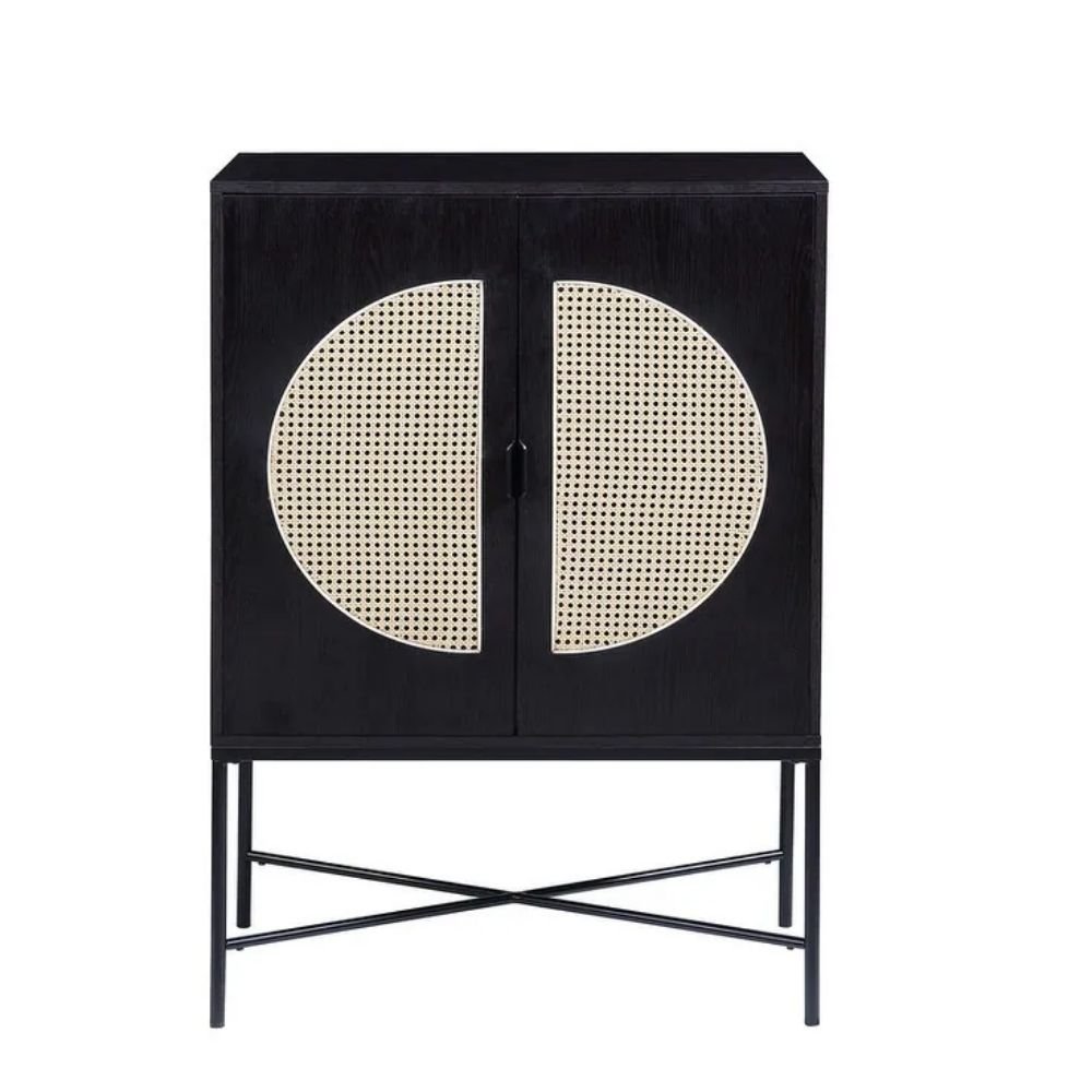 Crafted from solid wood, this wine cabinet features striking black tones softened by natural cane inserts. The unique half-moon cane pattern on each door offers visual intrigue and texture, making this piece both functional and artistic.