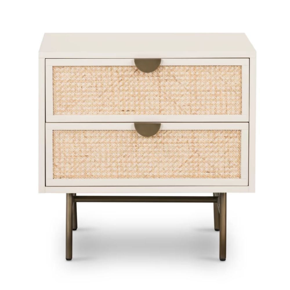 Hand-Woven Cane Fronts: Features two drawers with natural rattan inserts for a breathable and organic 3D texture.