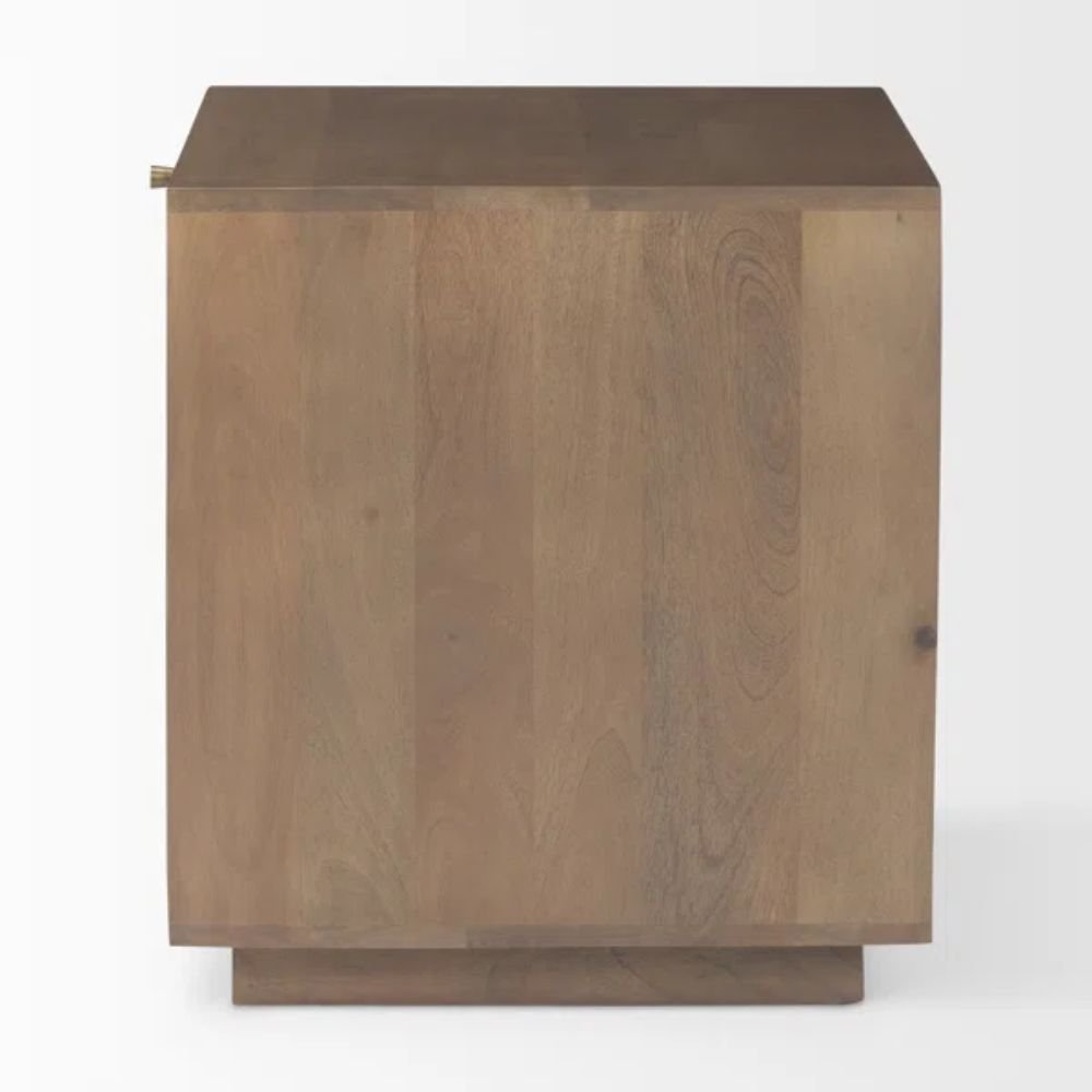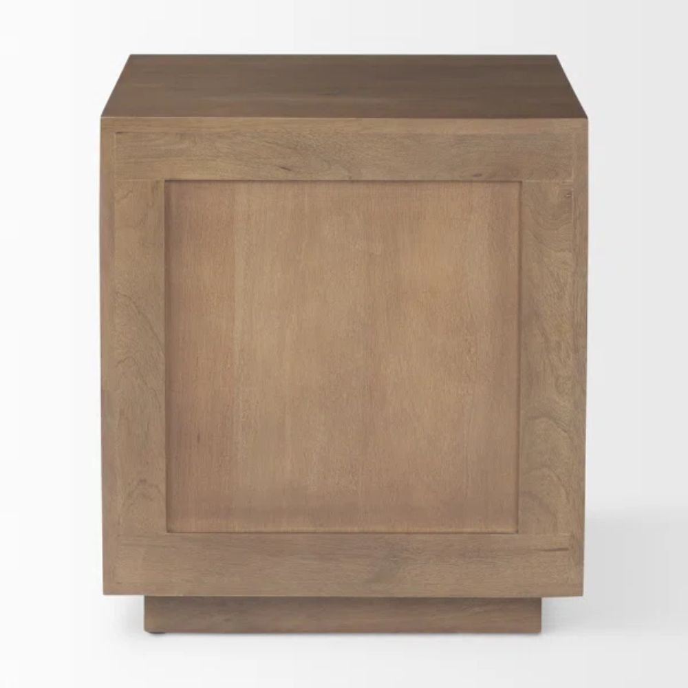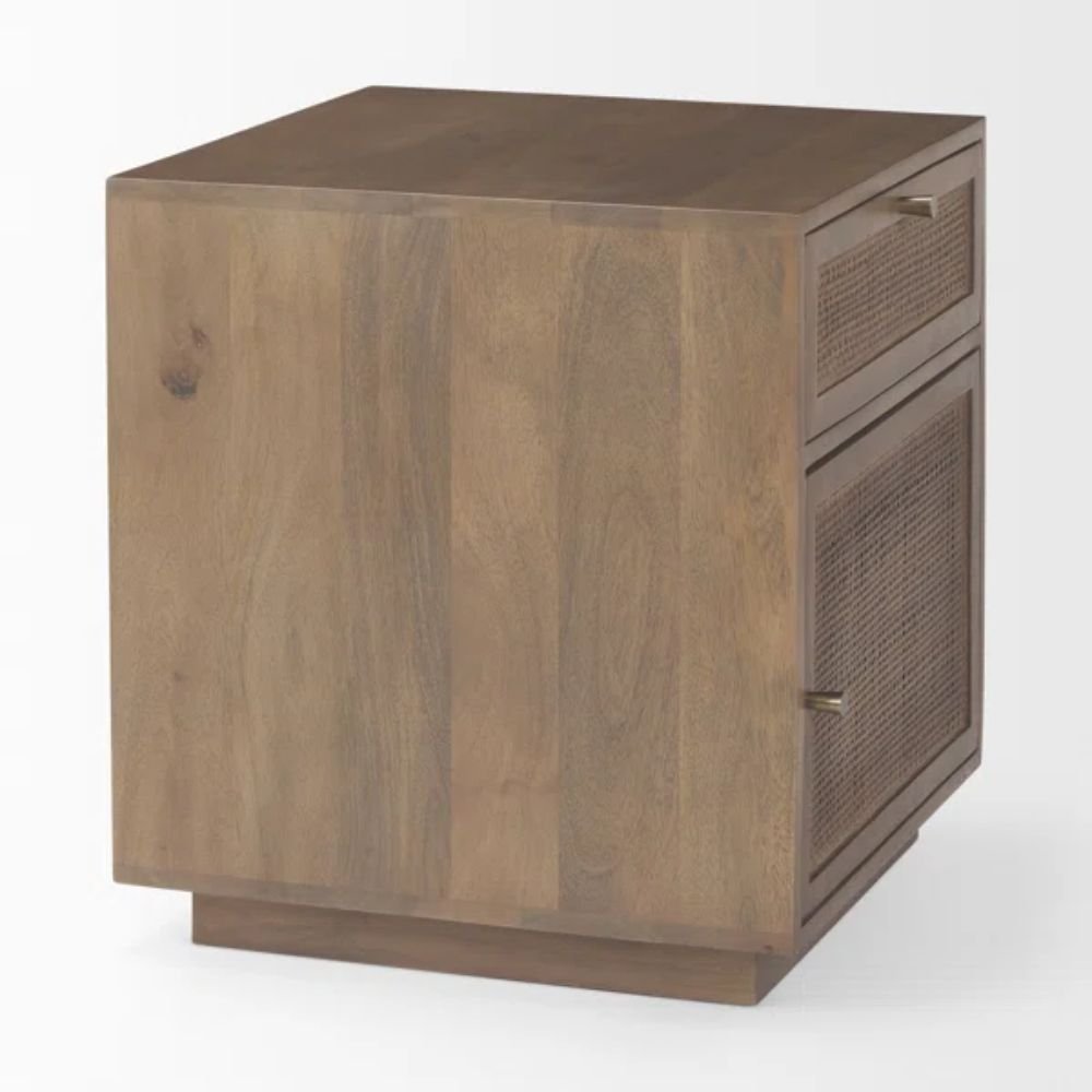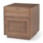 Modern medium brown solid wood end table with natural cane woven drawer and cabinet fronts - Modera Furnish