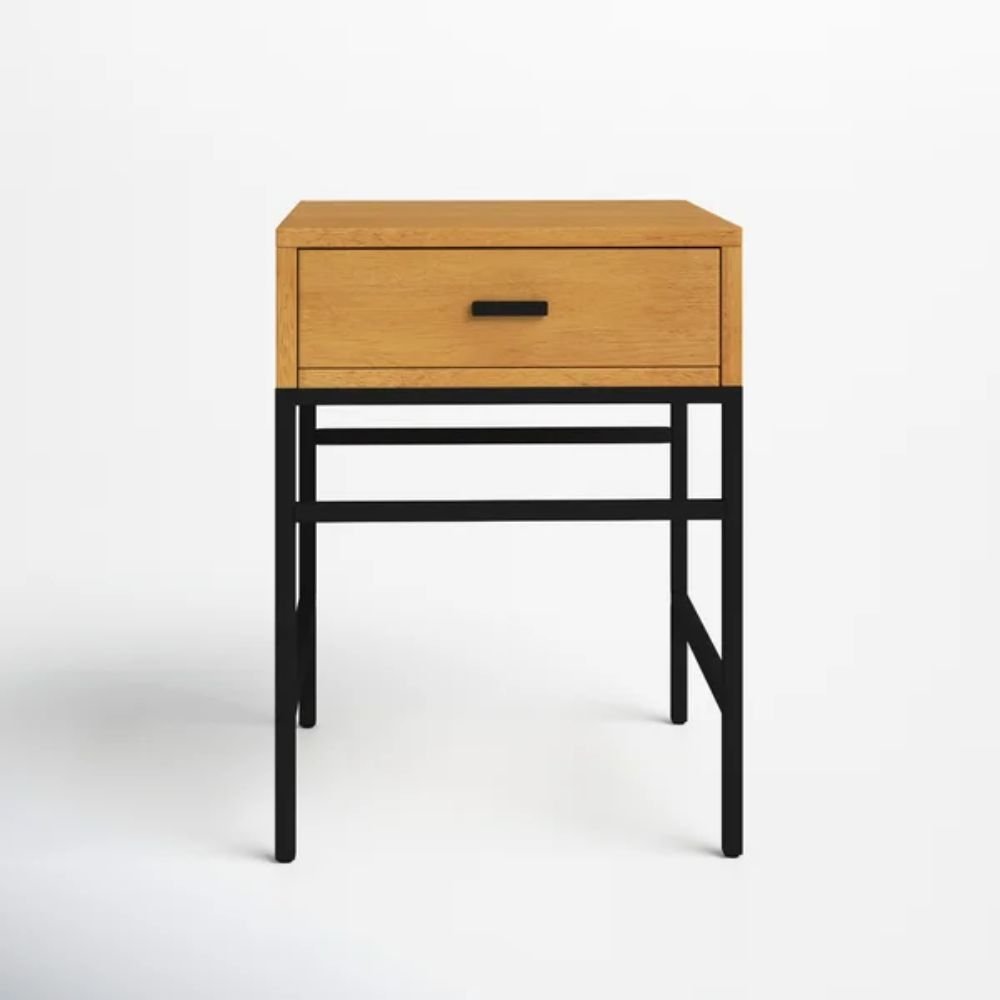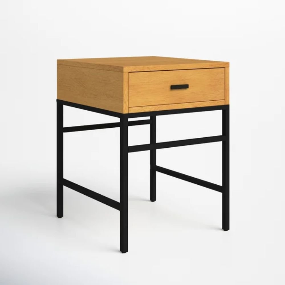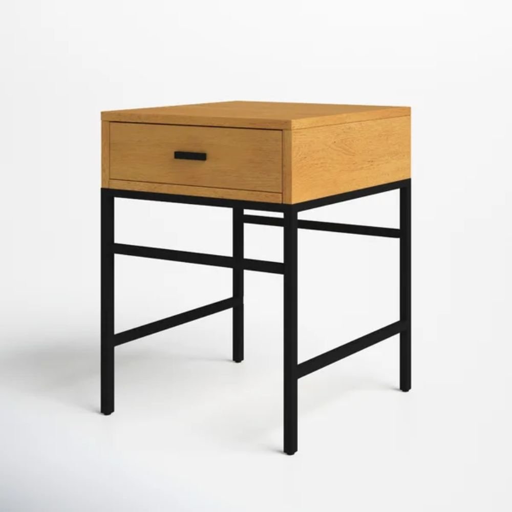 Industrial modern end table with a matte black metal frame and a single-drawer solid wood cabinet in a natural oak finish - Modera Furnish