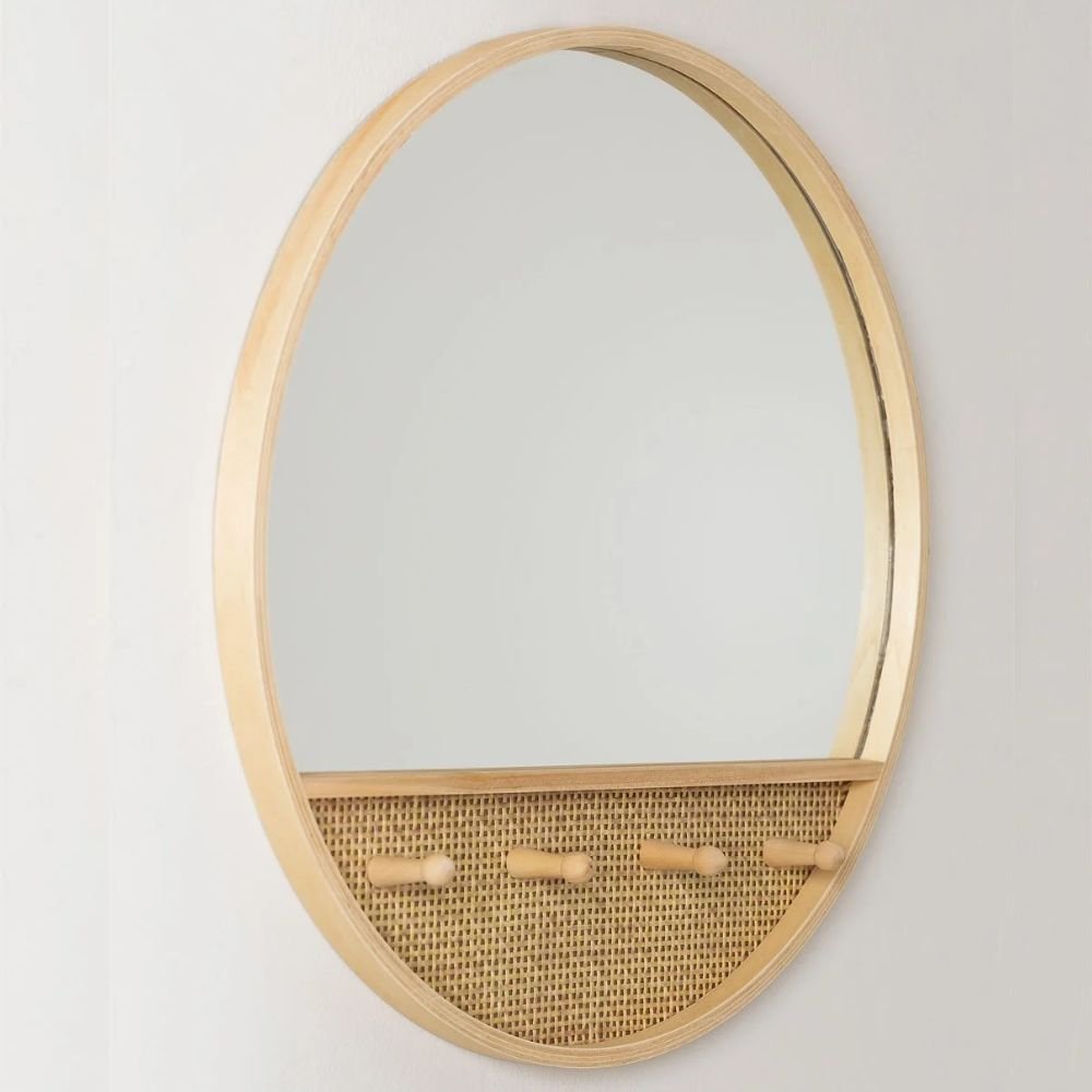 Home Collections Cane Collection Wooden Round Wall Mirror with Hooks Tinka